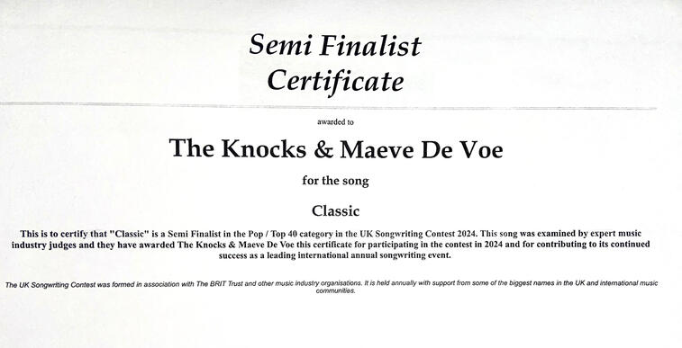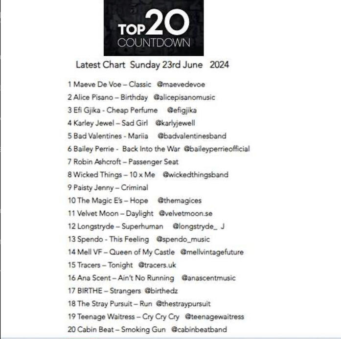 In 2023, she had 3 singles featured on compilation albums top the official iTunes UK charts, as well as on Amazon Music UK "New Albums" and "Movers & Shakers". She has had 7 major record labels consistently show interest in her music, including Disney, Virgin, RCA, Capitol, Warner, Motown, and Atlantic. De Voe also had a single considered by the NFL for a holiday commercial, and a top 2 final contender for a major movie production's ending credits. She has also had interest shown from the Dallas Cowboys, the New Orleans Saints, and Miami Dolphins dance teams with her hit music. De Voe is involved in music licensing, as well as her music and album artwork being officially and legally copyrighted with the US Library of Congress since 2021. Maeve De Voe has collaborated on a single with Radio Wigwam's Band of the Year "Paytron Saint", and was played on BBC Midlands Radio {with said song}.Please see "ALL MY MUSIC" for all charting numbers,